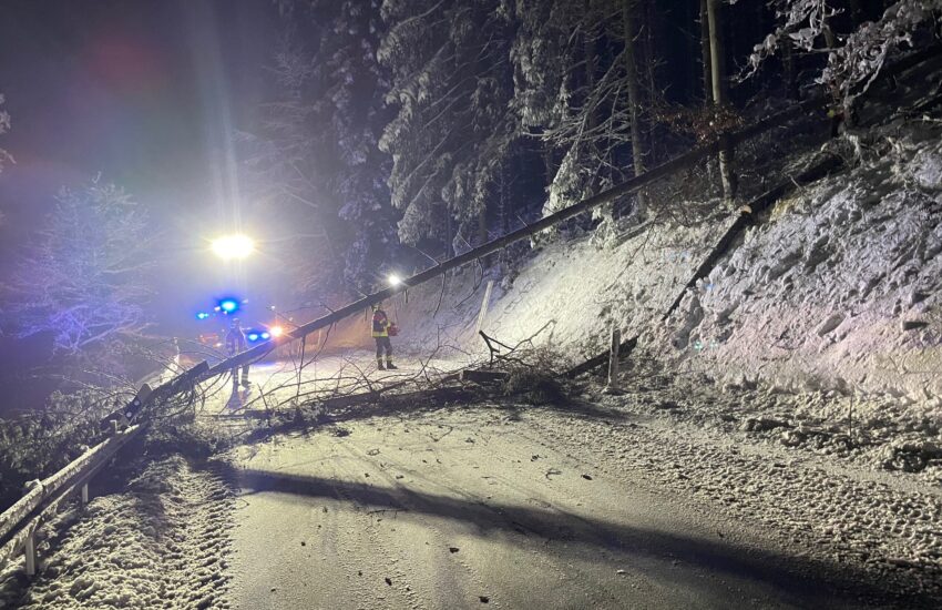 Zwei Bäume sind über Fahrbahn gefallen und blockierten diese, dabei wurde die Leitplanke beschädigt. ein weiterer Baum war halb entwurzelt, dieser wurde sicherheitshalber gefällt. Die Straße war während der Arbeiten voll gesperrt.